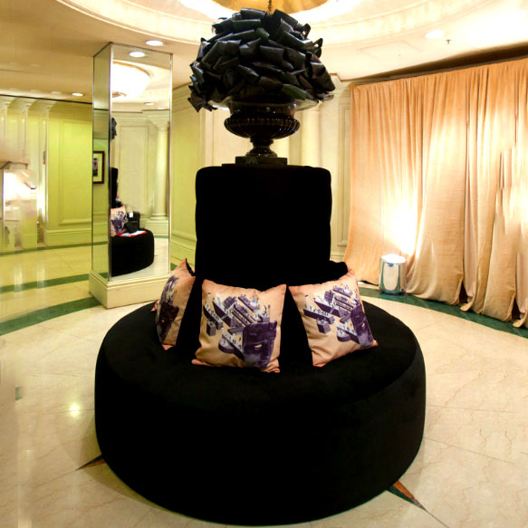 Circular Bourne seat upholstered in black velvet, with or without buttoned backrest. Conversation piece that can be customised to your party theme with floral decoration through the hollow backrest.